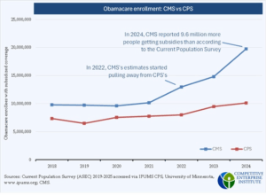One of the major challenges embedded within the ACA subsidy issue is a concern about fraud or fraudulent enrollment. Since COVID era expansion, there has been a growing series of voices raising alarm (I am one) that the enrollment growth seemed juxtaposed to known utilization trends. The graph below, courtesy of the Competitive Enterprise Institute illustrates a gap between surveyed brokers and participants and CMS data.